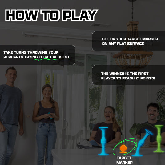 - Players rotate throwing one at a time toward the Orange Target Marker until all 12 Popdarts have been thrown.