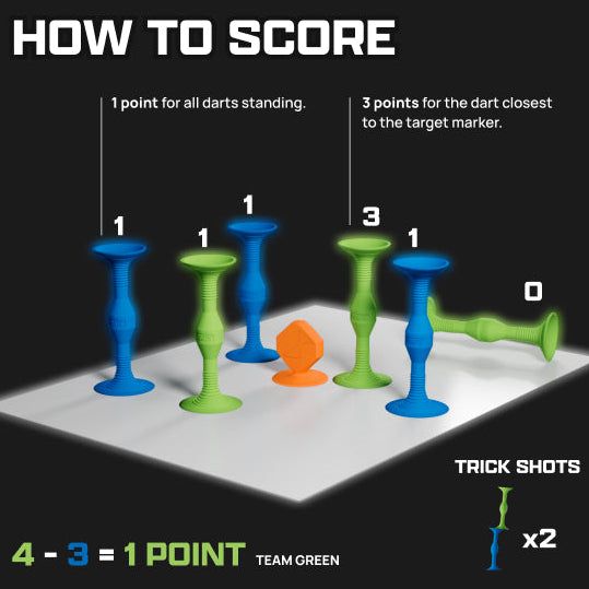 - Players rotate throwing one at a time toward the Orange Target Marker until all Popdarts have been thrown. ONLY THE TOP TWO PLAYERS' POINTS ARE USED IN EACH ROUND.