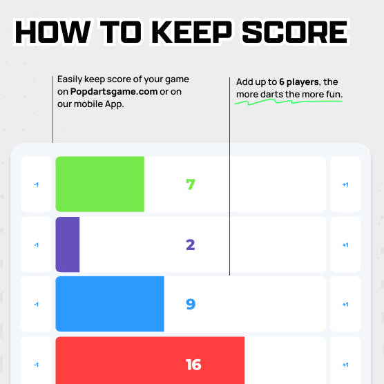 - You will need one set of Original Popdarts and one set of our Expansion Pack (Purple and Yellow colors). Then each player will have 3 Popdarts either Blue, Green, Purple or Yellow.